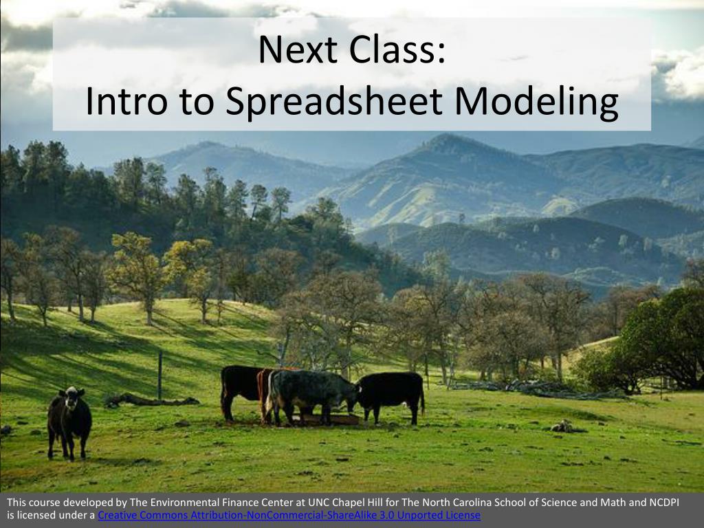 Next Class: Intro to Spreadsheet Modeling This course developed by The Environmental Finance Center at UNC Chapel Hill for The North Carolina School of Science and Math and NCDPI is licensed under a Creative Commons Attribution-NonCommercial-ShareAlike 3.0 Unported License