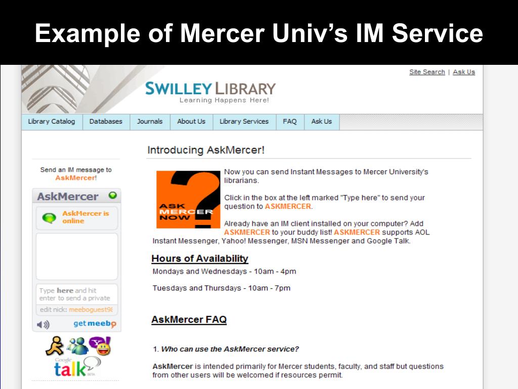 Promotion & Assessment • Promote your IM availability to patrons, co-workers, etc. through word of mouth, web pages, press releases, signage, where ever appropriate • Evaluate your IM presence: metrics, chat logs, surveys, feedback, focus groups, etc.