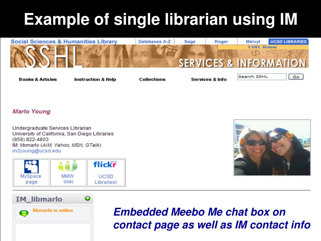 Example of single librarian using IM Embedded Meebo Me chat box on contact page as well as IM contact info
