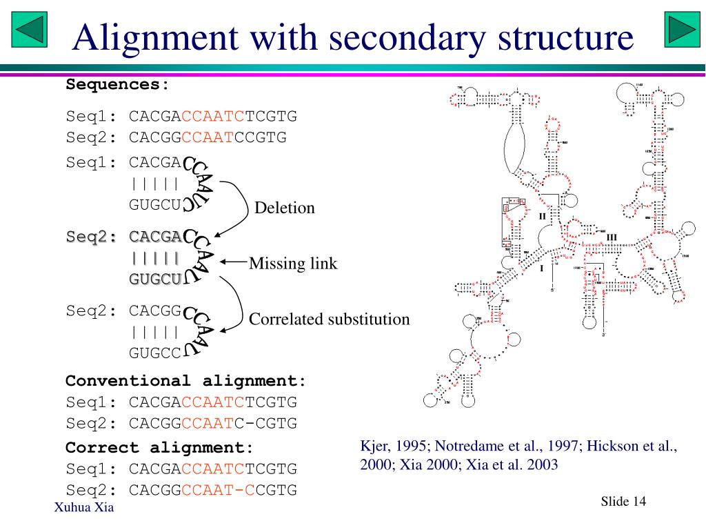 Alignment with secondary structure Sequences: Seq1: CACGACCAATCTCGTGSeq2: CACGGCCAATCCGTG Seq1: CACGA ||||| GUGCU Seq2: CACGA ||||| GUGCU Seq2: CACGG ||||| GUGCC CCAAUC Deletion CCAAU Missing link CCAAU Correlated substitution Conventional alignment: Seq1: CACGACCAATCTCGTG Seq2: CACGGCCAATC-CGTG Kjer, 1995; Notredame et al., 1997; Hickson et al., 2000; Xia 2000; Xia et al. 2003 Correct alignment: Seq1: CACGACCAATCTCGTG Seq2: CACGGCCAAT-CCGTG Slide 14