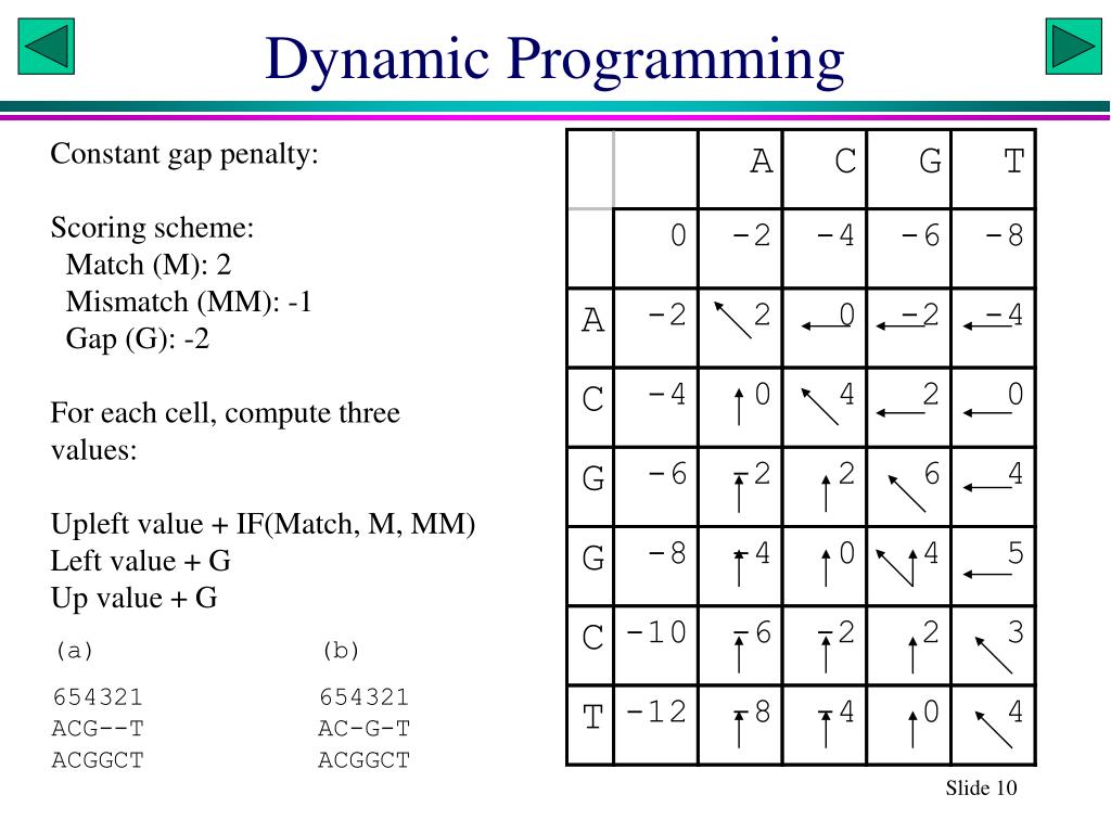 Dynamic Programming Constant gap penalty: Scoring scheme: Match (M): 2 Mismatch (MM): -1 Gap (G): -2 For each cell, compute three values: Upleft value + IF(Match, M, MM)Left value + GUp value + G Slide 10