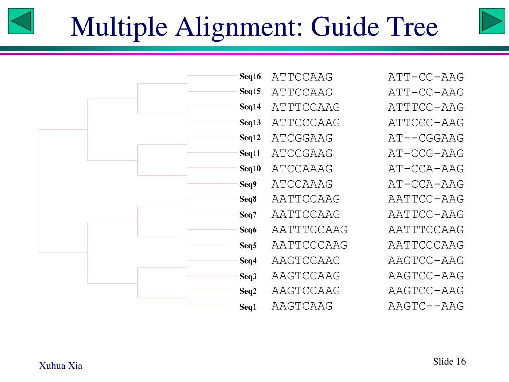 Multiple Alignment: Guide Tree Seq16 Seq15 Seq14 Seq13 Seq12 Seq11 Seq10 Seq9 Seq8 Seq7 Seq6 Seq5 Seq4 Seq3 Seq2 Seq1 ATTCCAAG ATTCCAAG ATTTCCAAG ATTCCCAAG ATCGGAAG ATCCGAAG ATCCAAAG ATCCAAAG AATTCCAAG AATTCCAAG AATTTCCAAG AATTCCCAAG AAGTCCAAG AAGTCCAAG AAGTCCAAG AAGTCAAG ATT-CC-AAG ATT-CC-AAG ATTTCC-AAG ATTCCC-AAG AT--CGGAAG AT-CCG-AAG AT-CCA-AAG AT-CCA-AAG AATTCC-AAG AATTCC-AAG AATTTCCAAG AATTCCCAAG AAGTCC-AAG AAGTCC-AAG AAGTCC-AAG AAGTC--AAG Slide 16