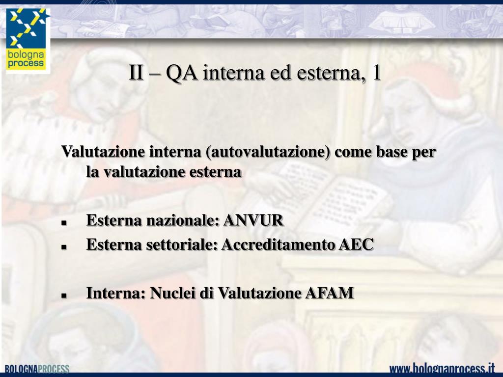 II – QA interna ed esterna, 1 Valutazione interna (autovalutazione) come base per la valutazione esterna • Esterna nazionale: ANVUR • Esterna settoriale: Accreditamento AEC • Interna: Nuclei di Valutazione AFAM
