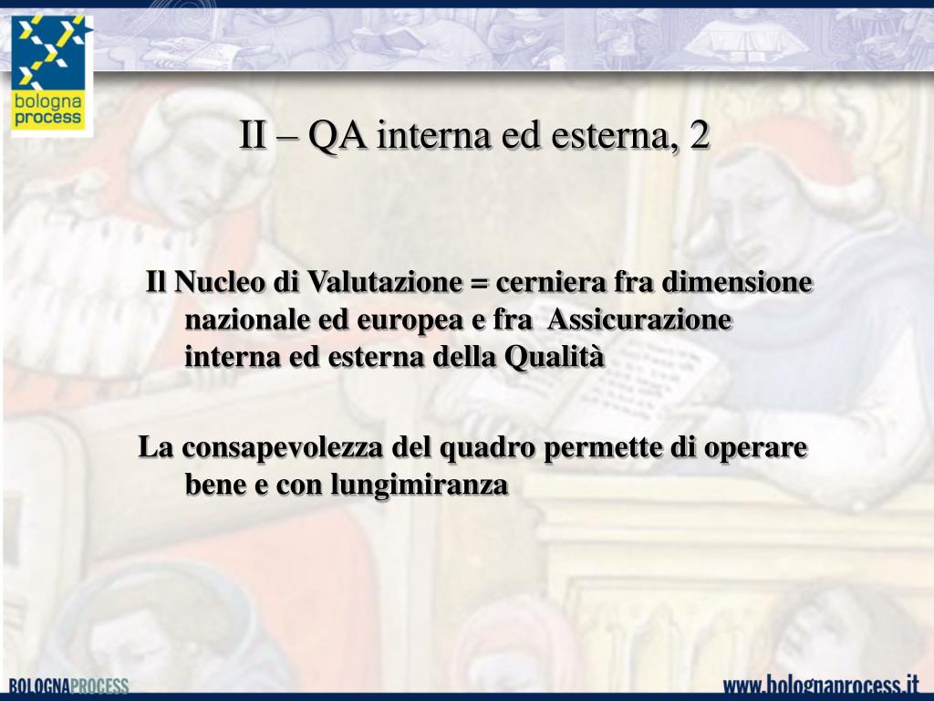 II – QA interna ed esterna, 2 Il Nucleo di Valutazione = cerniera fra dimensione nazionale ed europea e fra Assicurazione interna ed esterna della Qualità La consapevolezza del quadro permette di operare bene e con lungimiranza
