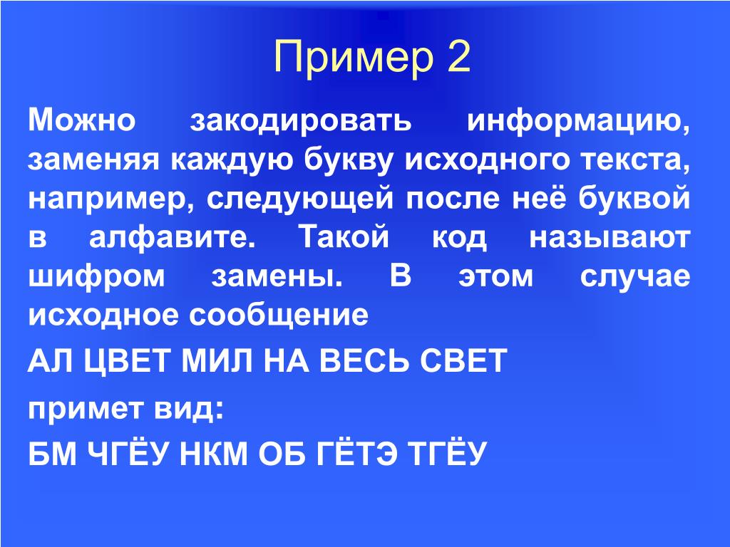 10. Пример 2 Можно закодировать информацию, заменяя каждую букву исходного текста, например, следую­щей после неё буквой в алфавите. Такой код называют шифром замены. В этом случае исходное сообщение АЛ ЦВЕТ МИЛ НА ВЕСЬ СВЕТ примет вид: БМ ЧГЁУ НКМ ОБ ГЁТЭ ТГЁУ
