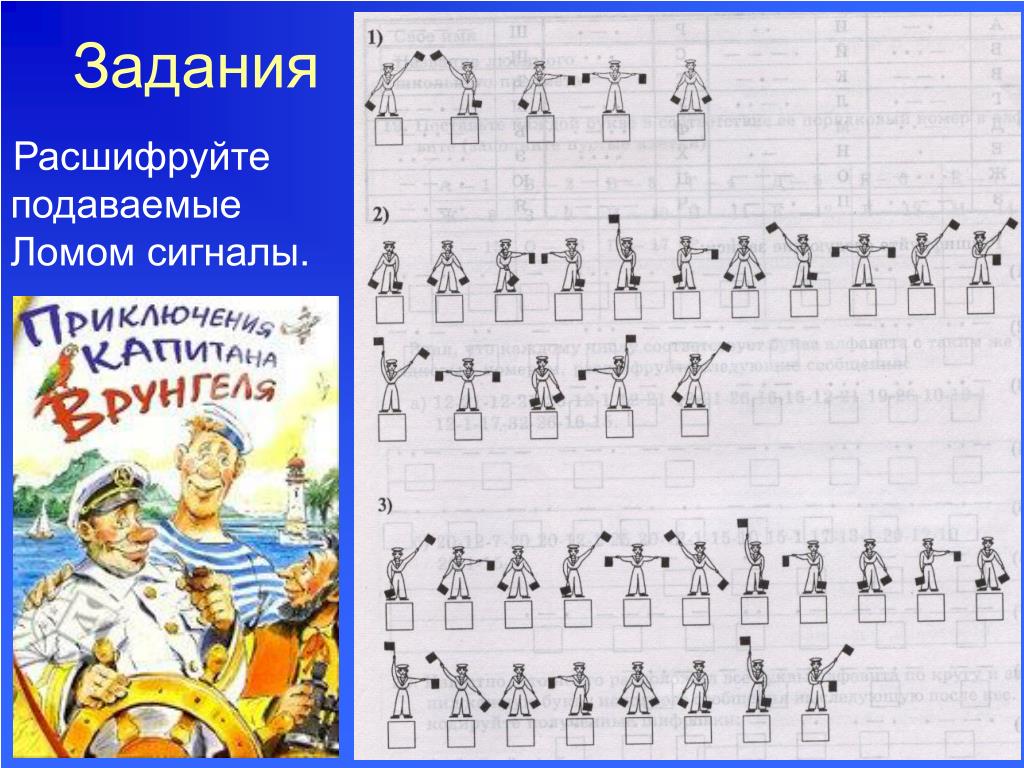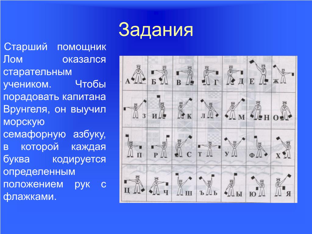 16. Задания Старший помощник Лом оказался старательным учеником. Чтобы порадовать капитана Врунгеля, он выучил морскую семафорную азбуку, в которой каждая буква кодируется определенным положением рук с флажками.