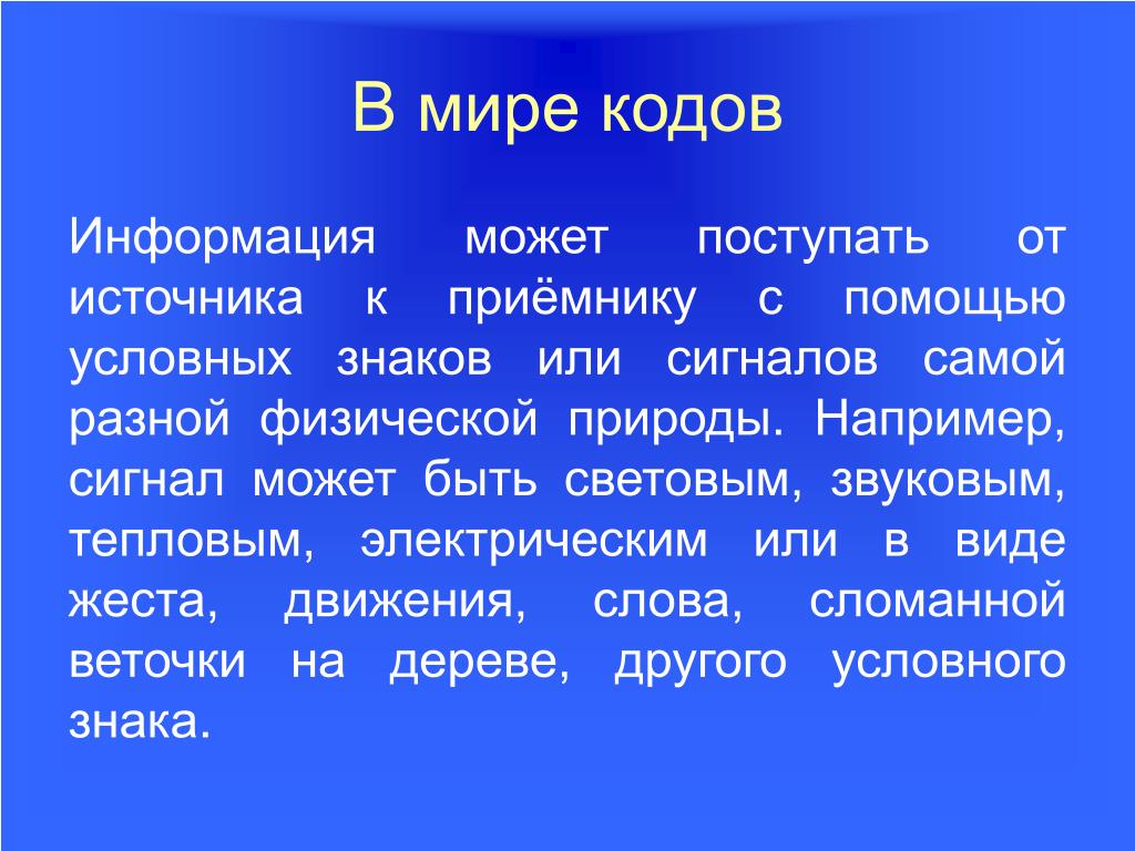 2. В мире кодов Информация может поступать от источника к приёмнику с помощью условных знаков или сигналов самой разной физической природы. Например, сигнал может быть световым, звуковым, тепловым, электрическим или в виде жеста, движения, слова, сломанной веточки на дереве, другого условного знака.