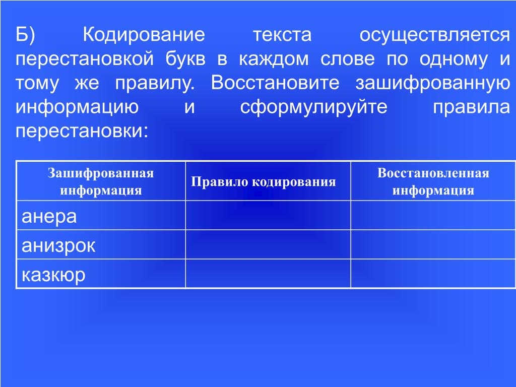 22. А) Кодирование текста осуществляется перестановкой букв в каждом слове по одному и тому же правилу. Восстановите зашифрованную информацию и сформулируйте правила перестановки: