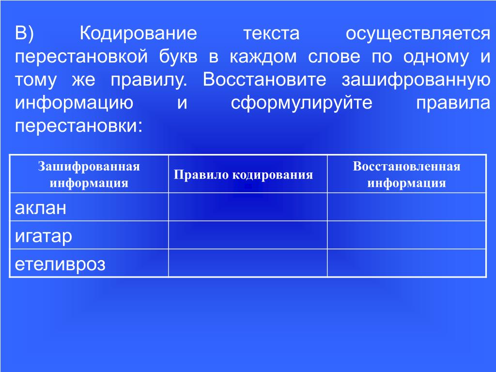 25. Г) Кодирование текста осуществляется перестановкой букв в каждом слове по одному и тому же правилу. Восстановите зашифрованную информацию и сформулируйте правила перестановки: