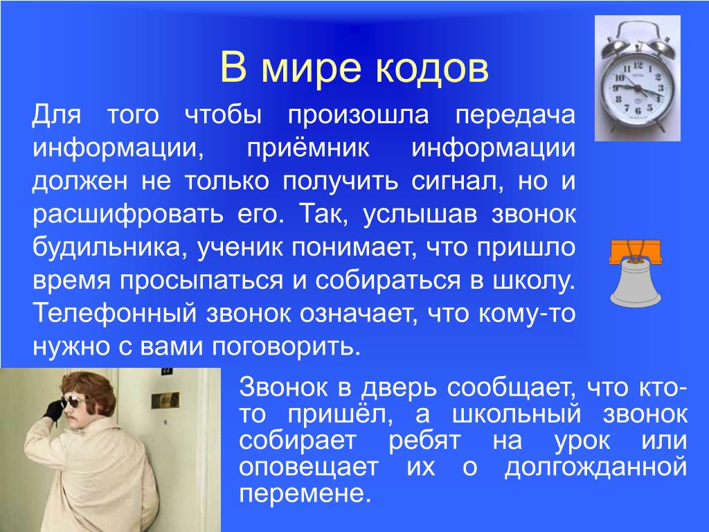 3. В мире кодов Для того чтобы произошла передача информации, приёмник информации должен не только получить сигнал, но и расшифровать его. Так, услышав звонок будильника, ученик понимает, что пришло время просыпаться и собираться в школу. Телефонный звонок означает, что кому-то нужно с вами поговорить. Звонок в дверь сообщает, что кто-то пришёл, а школьный звонок собирает ребят на урок или оповещает их о долгожданной перемене.