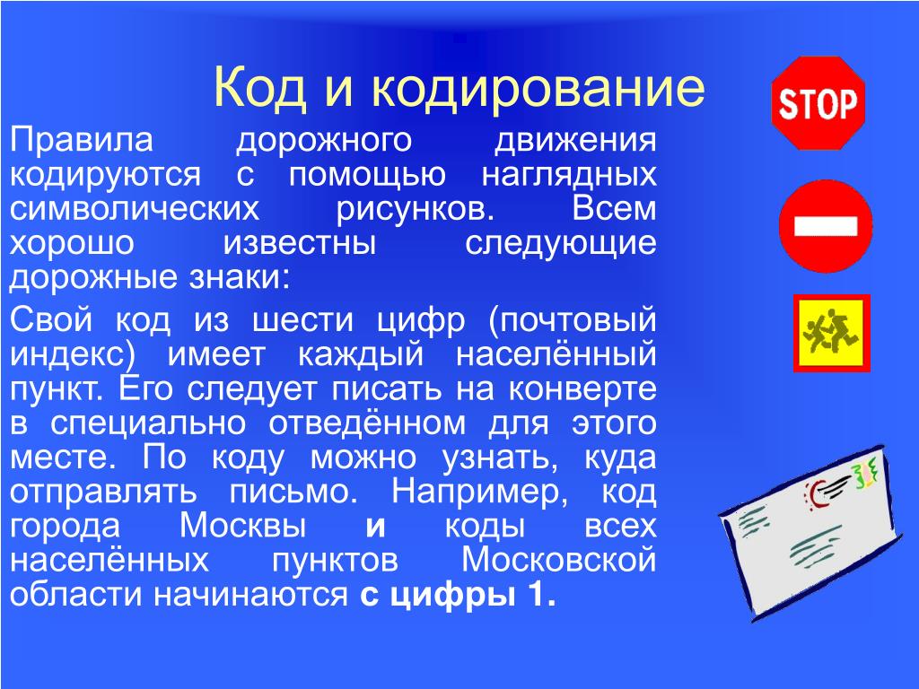6. Код и кодирование Правила дорожного движения кодируются с помощью наглядных символических рисунков. Всем хорошо известны следующие дорожные знаки: Свой код из шести цифр (почтовый индекс) имеет каждый населённый пункт. Его следует писать на конверте в специально отведённом для этого месте. По коду можно узнать, куда отправлять письмо. Например, код города Москвы и коды всех населённых пунктов Московской области начинаются с цифры 1.