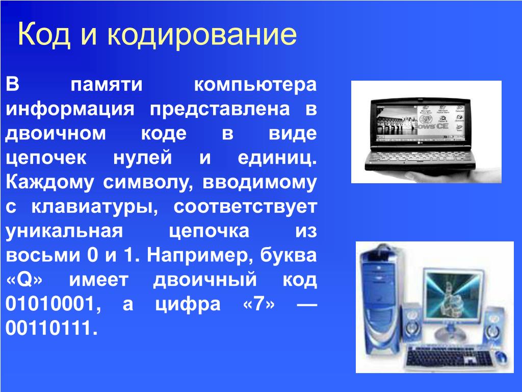 8. Код и кодирование В памяти компьютера информация представлена в двоичном коде в виде цепочек нулей и единиц. Каждому символу, вводимому с клавиатуры, соответствует уникальная цепочка из восьми 0 и 1. Например, буква «Q» имеет двоичный код 01010001, а цифра «7» — 00110111.