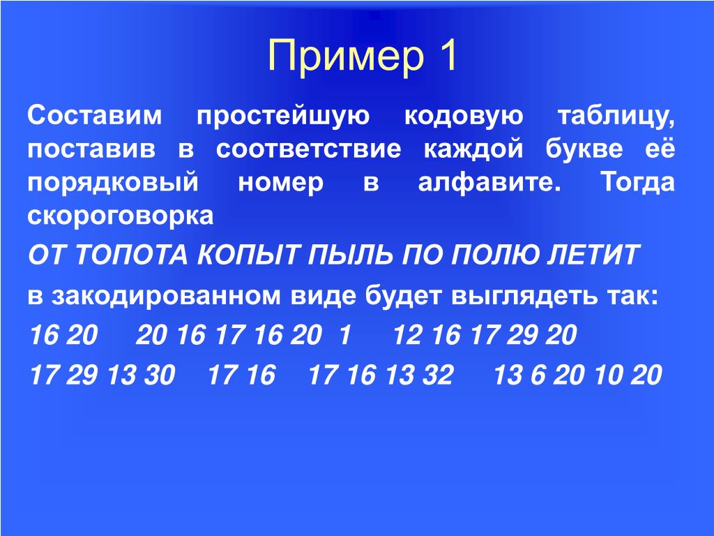 9. Пример 1 Составим простейшую кодовую таблицу, поставив в соответствие каждой букве её порядковый номер в алфавите. Тогда скороговорка ОТ ТОПОТА КОПЫТ ПЫЛЬ ПО ПОЛЮ ЛЕТИТ в закодированном виде будет выглядеть так: 16 20 20 16 17 16 20 1 12 16 17 29 20 17 29 13 30 17 16 17 16 13 32 13 6 20 10 20