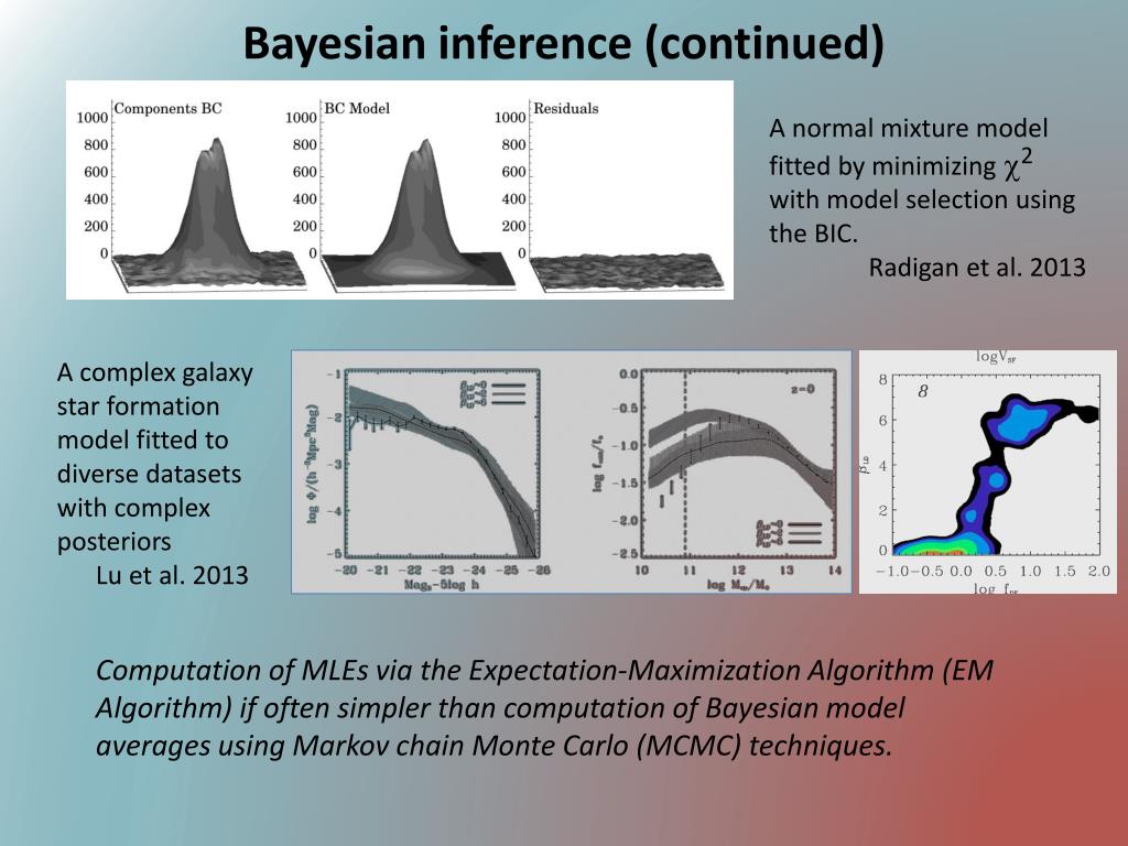 Bayesian inference (continued) A normal mixture model fitted by minimizing c2 with model selection using the BIC. Radigan et al. 2013 Computation of MLEs via the Expectation-Maximization Algorithm (EM Algorithm) if often simpler than computation of Bayesian model averages using Markov chain Monte Carlo (MCMC) techniques. A complex galaxy star formation model fitted to diverse datasets with complex posteriors Lu et al. 2013