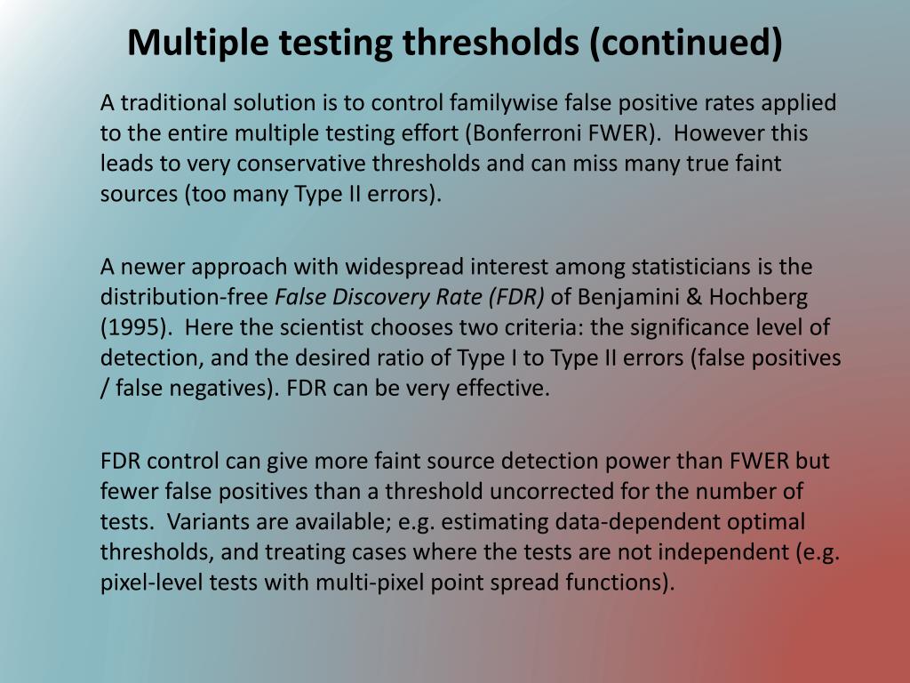 Multiple testing thresholds (continued) A traditional solution is to control familywise false positive rates applied to the entire multiple testing effort (Bonferroni FWER). However this leads to very conservative thresholds and can miss many true faint sources (too many Type II errors). A newer approach with widespread interest among statisticians is the distribution-free False Discovery Rate (FDR) of Benjamini & Hochberg (1995). Here the scientist chooses two criteria: the significance level of detection, and the desired ratio of Type I to Type II errors (false positives / false negatives). FDR can be very effective. FDR control can give more faint source detection power than FWER but fewer false positives than a threshold uncorrected for the number of tests. Variants are available; e.g. estimating data-dependent optimal thresholds, and treating cases where the tests are not independent (e.g. pixel-level tests with multi-pixel point spread functions).