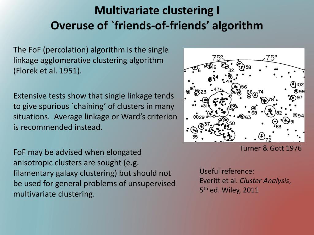 Multivariate clustering IOveruse of `friends-of-friends’ algorithm The FoF (percolation) algorithm is the single linkage agglomerative clustering algorithm (Florek et al. 1951). Extensive tests show that single linkage tends to give spurious `chaining’ of clusters in many situations. Average linkage or Ward’s criterion is recommended instead. FoF may be advised when elongated anisotropic clusters are sought (e.g. filamentary galaxy clustering) but should not be used for general problems of unsupervised multivariate clustering. Turner & Gott1976 Useful reference: Everitt et al. Cluster Analysis, 5th ed. Wiley, 2011