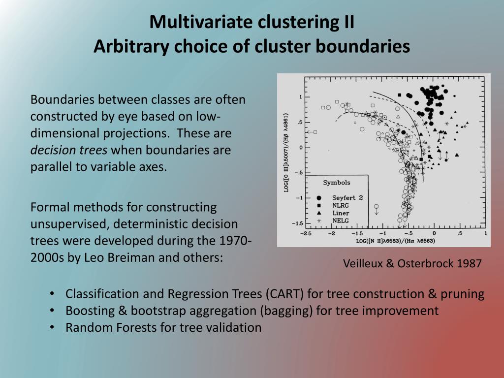 Multivariate clustering IIArbitrary choice of cluster boundaries Boundaries between classes are often constructed by eye based on low-dimensional projections. These are decision trees when boundaries are parallel to variable axes. Formal methods for constructing unsupervised, deterministic decision trees were developed during the 1970-2000s by Leo Breiman and others: • Veilleux& Osterbrock 1987 • Classification and Regression Trees (CART) for tree construction & pruning • Boosting & bootstrap aggregation (bagging) for tree improvement • Random Forests for tree validation
