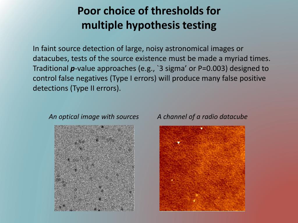 Poor choice of thresholds for multiple hypothesis testing In faint source detection of large, noisy astronomical images or datacubes, tests of the source existence must be made a myriad times. Traditional p-value approaches (e.g., `3 sigma’ or P=0.003) designed to control false negatives (Type I errors) will produce many false positive detections (Type II errors). An optical image with sources A channel of a radio datacube