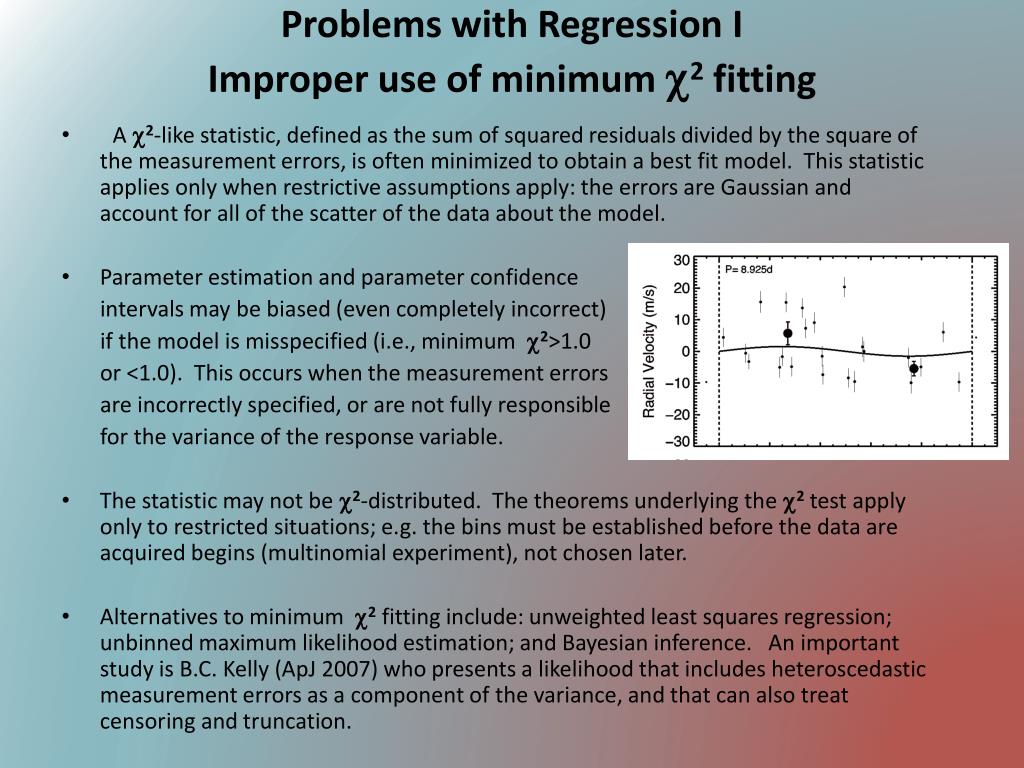 Problems with Regression IImproper use of minimum c2 fitting • A c2-like statistic, defined as the sum of squared residuals divided by the square of the measurement errors, is often minimized to obtain a best fit model. This statistic applies only when restrictive assumptions apply: the errors are Gaussian and account for all of the scatter of the data about the model. • Parameter estimation and parameter confidence intervals may be biased (even completely incorrect) if the model is misspecified (i.e., minimum c2>1.0 or <1.0). This occurs when the measurement errors are incorrectly specified, or are not fully responsible for the variance of the response variable. • The statistic may not be c2-distributed. The theorems underlying the c2 test apply only to restricted situations; e.g. the bins must be established before the data are acquired begins (multinomial experiment), not chosen later. • Alternatives to minimum c2 fitting include: unweighted least squares regression; unbinned maximum likelihood estimation; and Bayesian inference. An important study is B.C. Kelly (ApJ 2007) who presents a likelihood that includes heteroscedastic measurement errors as a component of the variance, and that can also treat censoring and truncation.