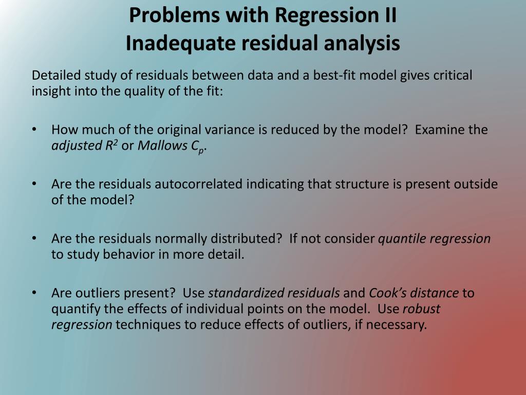 Problems with Regression IIInadequate residual analysis Detailed study of residuals between data and a best-fit model gives critical insight into the quality of the fit: • How much of the original variance is reduced by the model? Examine the adjusted R2 or Mallows Cp. • Are the residuals autocorrelated indicating that structure is present outside of the model? • Are the residuals normally distributed? If not consider quantile regression to study behavior in more detail. • Are outliers present? Use standardized residuals and Cook’s distance to quantify the effects of individual points on the model. Use robust regression techniques to reduce effects of outliers, if necessary.