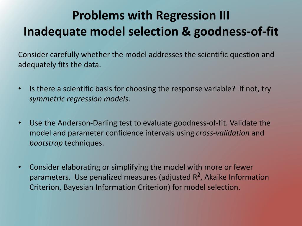 Problems with Regression IIIInadequate model selection & goodness-of-fit Consider carefully whether the model addresses the scientific question and adequately fits the data. • Is there a scientific basis for choosing the response variable? If not, try symmetric regression models. • Use the Anderson-Darling test to evaluate goodness-of-fit. Validate the model and parameter confidence intervals using cross-validation and bootstrap techniques. • Consider elaborating or simplifying the model with more or fewer parameters. Use penalized measures (adjusted R2, Akaike Information Criterion, Bayesian Information Criterion) for model selection.