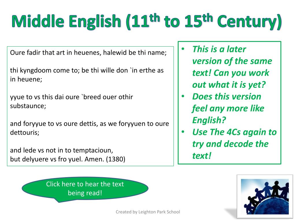 Middle English (11th to 15th Century) • This is a later version of the same text! Can you work out what it is yet? • Does this version feel any more like English? • Use The 4Cs again to try and decode the text! Ourefadir that art in heuenes, halewid be thi name; thikyngdoom come to; be thiwille don `in erthe as in heuene; yyue to vs this daioure `breed ouerothirsubstaunce; and foryyue to vsouredettis, as we foryyuen to ouredettouris; and ledevs not in to temptacioun, but delyuerevs fro yuel. Amen. (1380) Click here to hear the text being read! Created by Leighton Park School