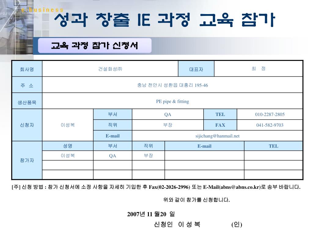 성과 창출 IE 과정 교육 참가 교육 과정 참가 신청서 [주] 신청 방법 : 참가 신청서에 소정 사항을 자세히 기입한 후 Fax(02-2026-2996) 또는 E-Mail(abns@abns.co.kr)로 송부 바랍니다. 위와 같이 참가를 신청합니다. 2007년 11 월20 일 신청인 이 성 복 (인)
