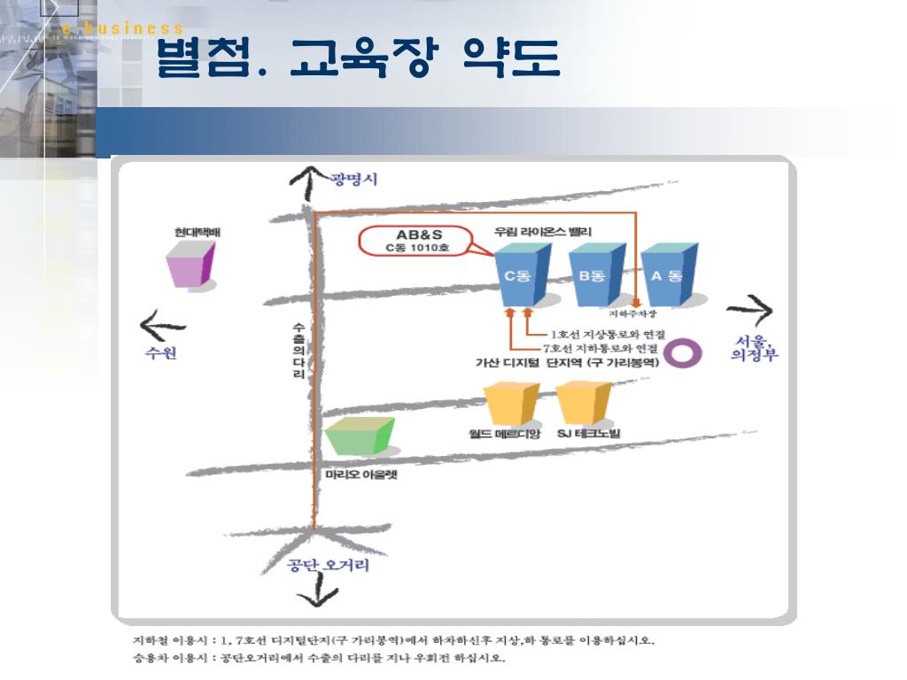 성과 창출 IE 과정 프로그램 교육강사, 일정 및 장소 등 • ♣ 교육 강사 : FCG 컨설팅 강신일 대표 컨설턴트 외 1명 • ♣ 교육 대상 : 생산기술/관리, 공정관리, 생산, 공정혁신 부문의 실무자 • 및 책임자 • ♣ 교육 일정 : 2007년 12월 13일(목) ~ 14일(금) / 2일, 출퇴근 • ♣ 교육 장소 : ㈜ AB&S 연수센터 • 금천구 가산동 우림 라이온스 밸리 C동 1010호 • (지하철 가산 디지털 단지역 도보 2분 거리) • 상세한 안내는 별첨 교육장 약도 참조) • ♣참가 비용 : 무료 (노동부 환급 과정)