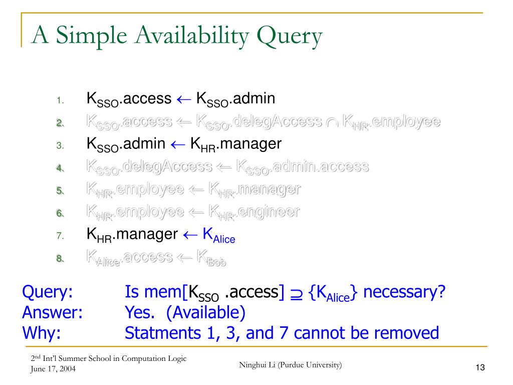 A Simple Availability Query • KSSO.accessKSSO.admin • KSSO.access KSSO.delegAccess KHR.employee • KSSO.adminKHR.manager • KSSO.delegAccess KSSO.admin.access • KHR.employee KHR.manager • KHR.employee KHR.engineer • KHR.manager KAlice • KAlice.access KBob Query: Is mem[KSSO .access] {KAlice} necessary? Answer: Yes. (Available) Why: Statments 1, 3, and 7 cannot be removed Ninghui Li (Purdue University)