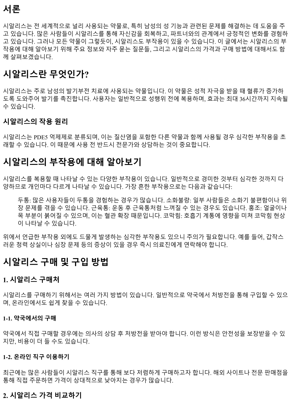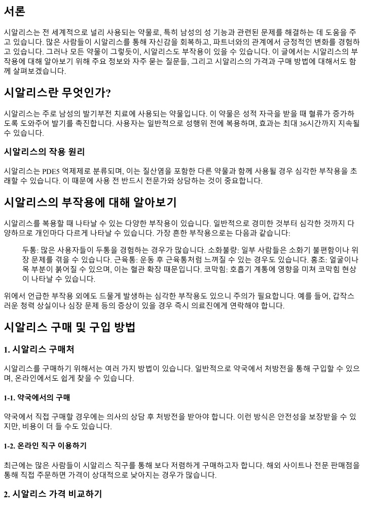 서론 시알리스는전세계적으로널리사용되는약물로, 특히남성의성기능과관련된문제를해결하는데도움을주 고있습니다. 많은사람들이시알리스를통해자신감을회복하고, 파트너와의관계에서긍정적인변화를경험하 고있습니다. 그러나모든약물이그렇듯이, 시알리스도부작용이있을수있습니다. 이글에서는시알리스의부 작용에대해알아보기위해주요정보와자주묻는질문들, 그리고시알리스의가격과구매방법에대해서도함 께살펴보겠습니다. 시알리스란무엇인가? 시알리스는주로남성의발기부전치료에사용되는약물입니다. 이약물은성적자극을받을때혈류가증가하 도록도와주어발기를촉진합니다. 사용자는일반적으로성행위전에복용하며, 효과는최대 36시간까지지속될 수있습니다. 시알리스의작용원리 시알리스는 PDE5 억제제로분류되며, 이는질산염을포함한다른약물과함께사용될경우심각한부작용을초 래할수있습니다. 이때문에사용전반드시전문가와상담하는것이중요합니다. 시알리스의부작용에대해알아보기 시알리스를복용할때나타날수있는다양한부작용이있습니다. 일반적으로경미한것부터심각한것까지다 양하므로개인마다다르게나타날수있습니다. 가장흔한부작용으로는다음과같습니다: 두통: 많은사용자들이두통을경험하는경우가많습니다. 소화불량: 일부사람들은소화기불편함이나위 장문제를겪을수있습니다. 근육통: 운동후근육통처럼느껴질수있는경우도있습니다. 홍조: 얼굴이나 목부분이붉어질수있으며, 이는혈관확장때문입니다. 코막힘: 호흡기계통에영향을미쳐코막힘현상 이나타날수있습니다. 위에서언급한부작용외에도드물게발생하는심각한부작용도있으니주의가필요합니다. 예를들어, 갑작스 러운청력상실이나심장문제등의증상이있을경우즉시의료진에게연락해야합니다. 시알리스구매및구입방법 1. 시알리스구매처 시알리스를구매하기위해서는여러가지방법이있습니다. 일반적으로약국에서처방전을통해구입할수있으 며, 온라인에서도쉽게찾을수있습니다. 1-1. 약국에서의구매 약국에서직접구매할경우에는의사의상담후처방전을받아야합니다. 이런방식은안전성을보장받을수있 지만, 비용이더들수도있습니다. 1-2. 온라인직구이용하기 최근에는많은사람들이시알리스직구를통해보다저렴하게구매하고자합니다. 해외사이트나전문판매점을 통해직접주문하면가격이상대적으로낮아지는경우가많습니다. 2. 시알리스가격비교하기