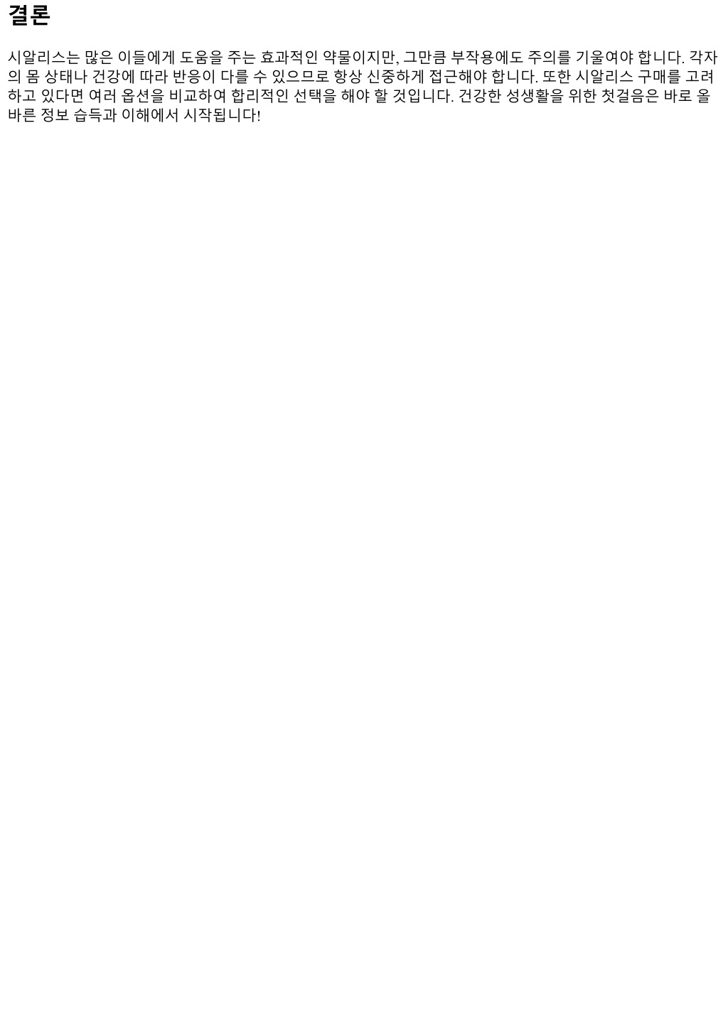 결론 시알리스는많은이들에게도움을주는효과적인약물이지만, 그만큼부작용에도주의를기울여야합니다. 각자 의몸상태나건강에따라반응이다를수있으므로항상신중하게접근해야합니다. 또한시알리스구매를고려 하고있다면여러옵션을비교하여합리적인선택을해야할것입니다. 건강한성생활을위한첫걸음은바로올 바른정보습득과이해에서시작됩니다!
