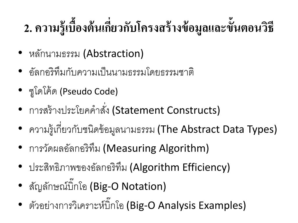2. ความรู้เบื้องต้นเกี่ยวกับโครงสร้างข้อมูลและขั้นตอนวิธี • หลักนามธรรม(Abstraction) • อัลกอริทึมกับความเป็นนามธรรมโดยธรรมชาติ • ซูโดโค้ด (Pseudo Code) • การสร้างประโยคคำสั่ง (Statement Constructs) • ความรู้เกี่ยวกับชนิดข้อมูลนามธรรม (The Abstract Data Types) • การวัดผลอัลกอริทึม (Measuring Algorithm) • ประสิทธิภาพของอัลกอริทึม (Algorithm Efficiency) • สัญลักษณ์บิ๊กโอ (Big-O Notation) • ตัวอย่างการวิเคราะห์บิ๊กโอ (Big-O Analysis Examples)