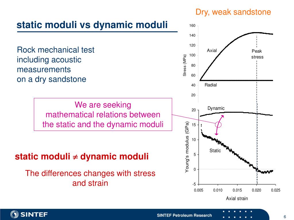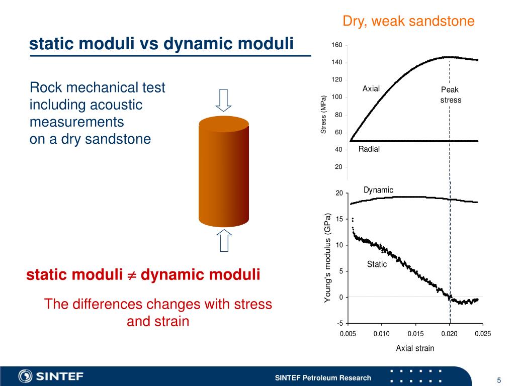 Dry, weak sandstone static moduli vs dynamic moduli Rock mechanical testincluding acoustic measurementson a dry sandstone We are seeking mathematical relations between the static and the dynamic moduli static moduli dynamic moduli The differences changes with stress and strain