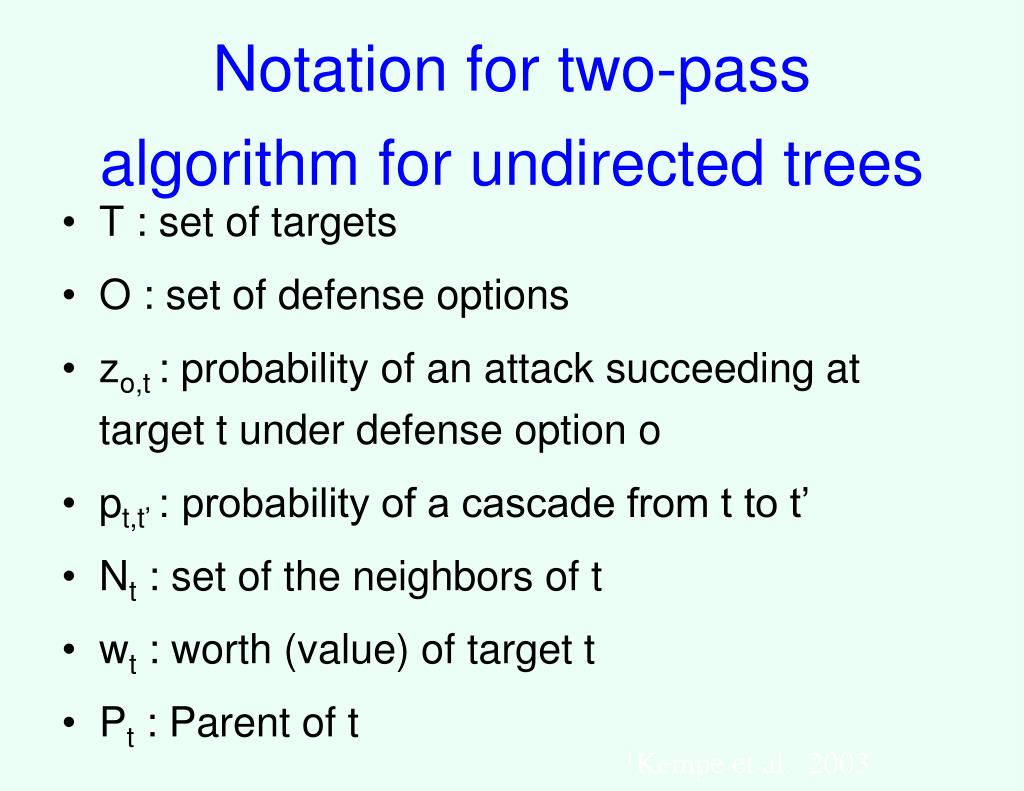 Notation for two-pass algorithm for undirected trees • T : set of targets • O : set of defense options • zo,t: probability of an attack succeeding at target t under defense option o • pt,t’ : probability of a cascade from t to t’ • Nt : set of the neighbors of t • wt : worth (value) of target t • Pt : Parent of t 1Kempe et al. 2003