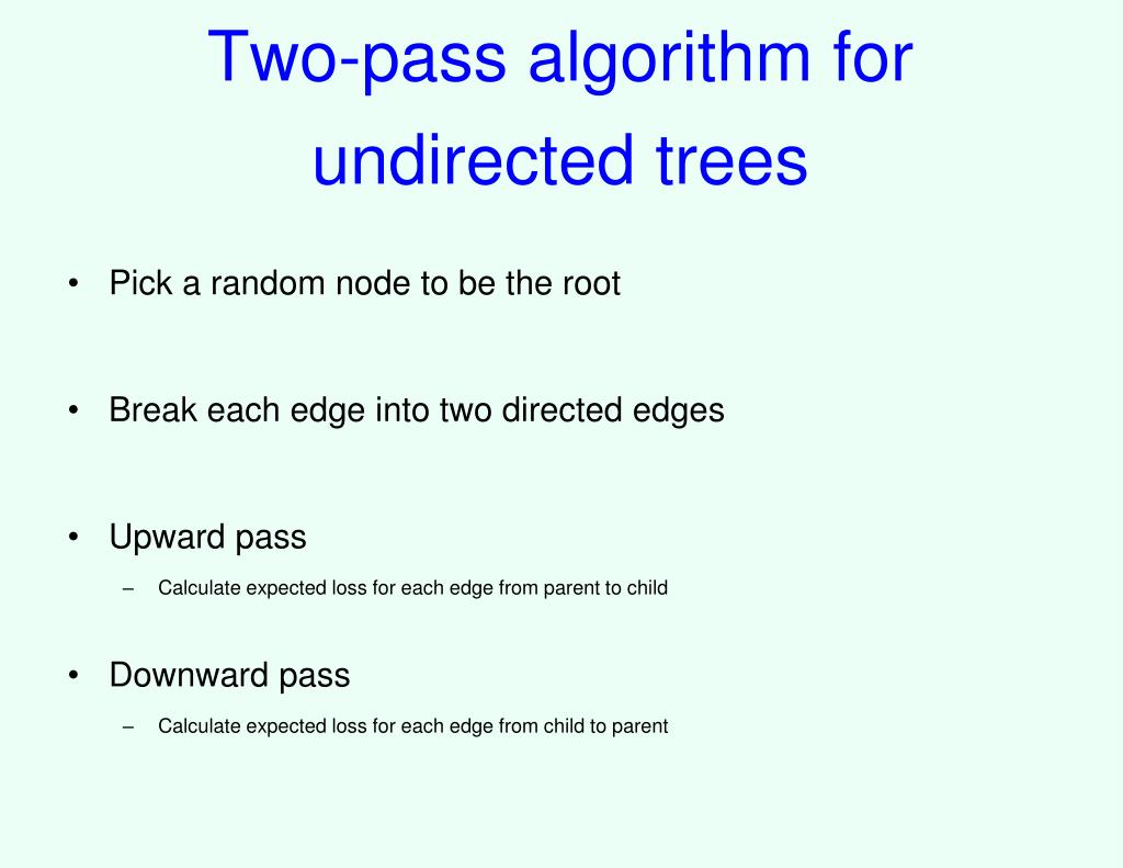 Two-pass algorithm for undirected trees • Pick a random node to be the root • Break each edge into two directed edges • Upward pass • Calculate expected loss for each edge from parent to child • Downward pass • Calculate expected loss for each edge from child to parent