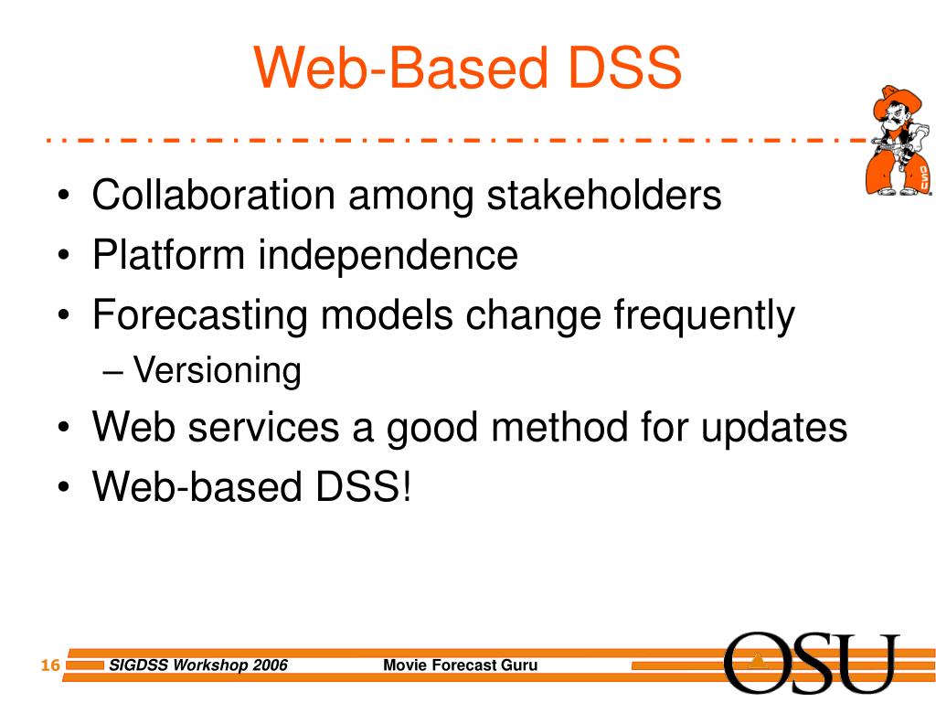 Web-Based DSS • Collaboration among stakeholders • Platform independence • Forecasting models change frequently • Versioning • Web services a good method for updates • Web-based DSS!