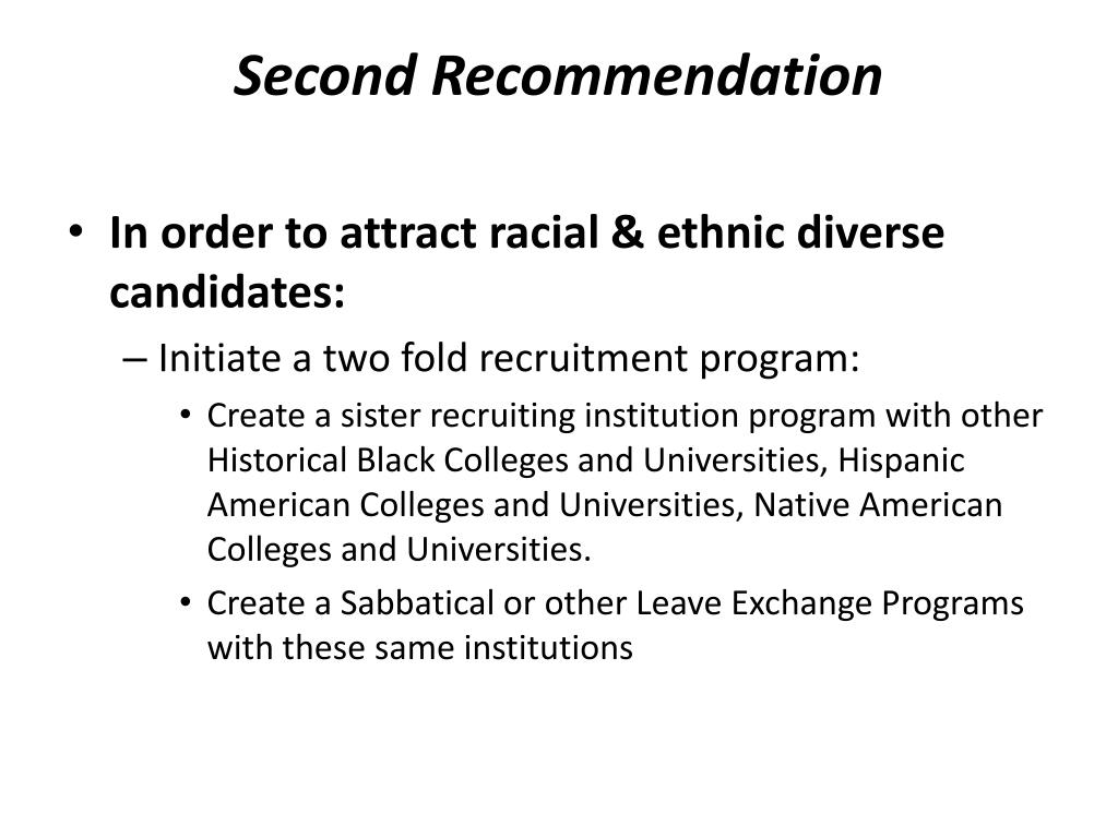 Second Recommendation • In order to attract racial & ethnic diverse candidates: • Initiate a two fold recruitment program: • Create a sister recruiting institution program with other Historical Black Colleges and Universities, Hispanic American Colleges and Universities, Native American Colleges and Universities. • Create a Sabbatical or other Leave Exchange Programs with these same institutions
