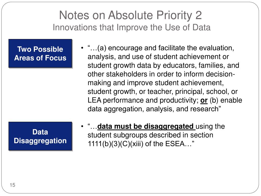 Notes on Absolute Priority 2 Innovations that Improve the Use of Data Two Possible Areas of Focus • “…(a) encourage and facilitate the evaluation, analysis, and useof student achievement or student growth data by educators, families, and other stakeholders in order to inform decision-making and improve student achievement, student growth, or teacher, principal, school, or LEA performance and productivity; or(b) enable data aggregation, analysis, and research” • “…data must be disaggregated using the student subgroups described in section 1111(b)(3)(C)(xiii) of the ESEA…” Data Disaggregation 15