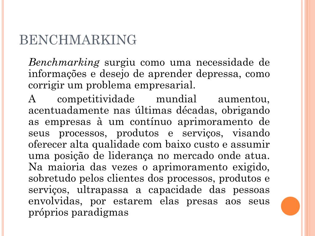 BENCHMARKING Benchmarking surgiu como uma necessidade de informações e desejo de aprender depressa, como corrigir um problema empresarial. A competitividade mundial aumentou, acentuadamente nas últimas décadas, obrigando as empresas à um contínuo aprimoramento de seus processos, produtos e serviços, visando oferecer alta qualidade com baixo custo e assumir uma posição de liderança no mercado onde atua. Na maioria das vezes o aprimoramento exigido, sobretudo pelos clientes dos processos, produtos e serviços, ultrapassa a capacidade das pessoas envolvidas, por estarem elas presas aos seus próprios paradigmas