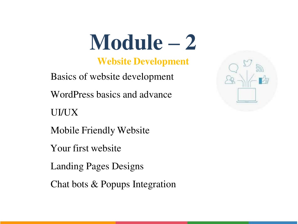 Module – 2 Website Development Basics of website development WordPress basics and advance UI/UX Mobile Friendly Website Your first website Landing Pages Designs Chat bots & Popups Integration