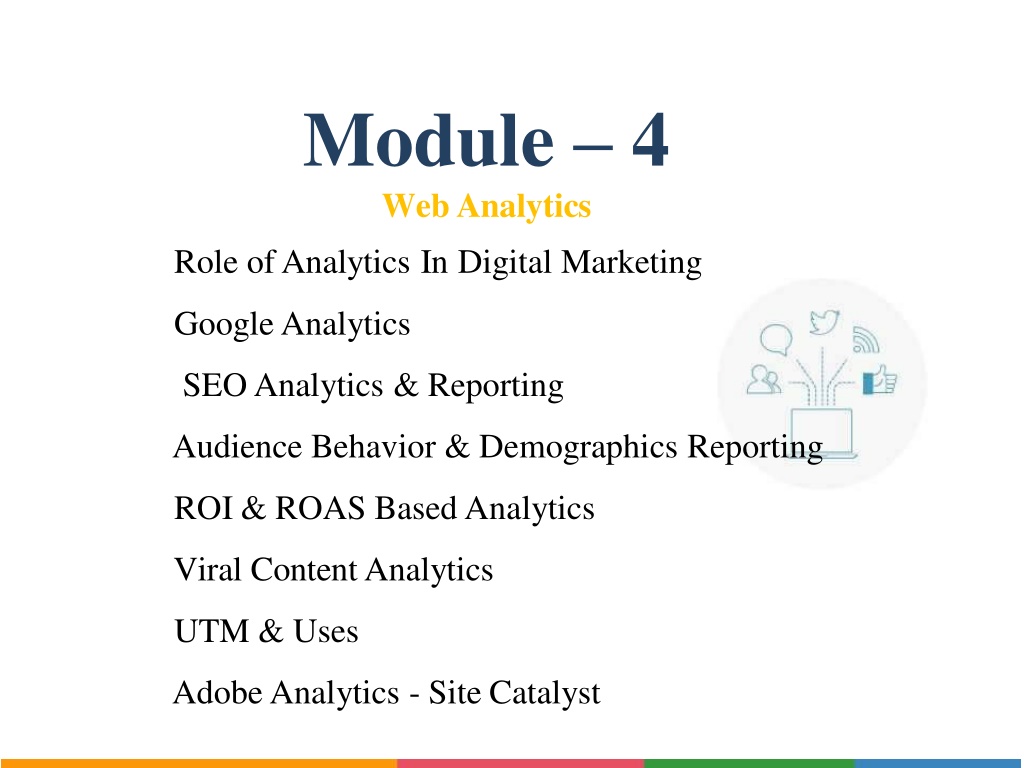 Module – 4 Web Analytics Role of Analytics In Digital Marketing Google Analytics SEO Analytics & Reporting Audience Behavior & Demographics Reporting ROI & ROAS Based Analytics Viral Content Analytics UTM & Uses Adobe Analytics - Site Catalyst