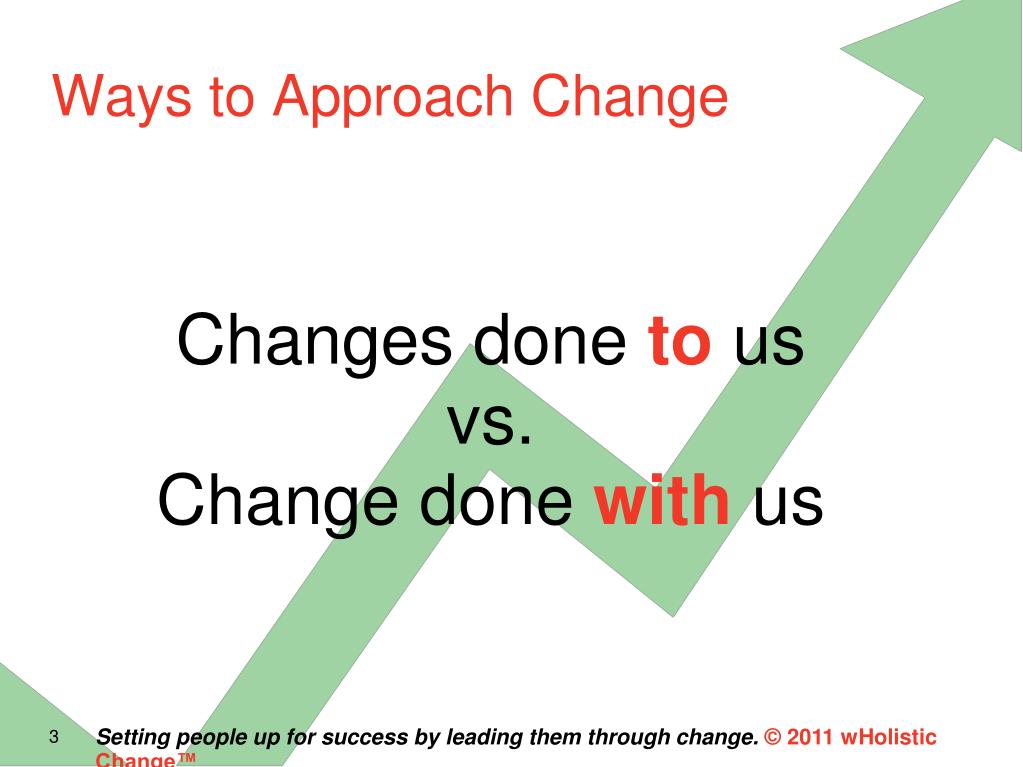 Leading a wHolistic Change ™. http://www.ted.com/talks/lang/eng/derek_sivers_how_to_start_a_movement.html. Courtesy Derek Sivers sivers.org. 2. Changes done to us vs. Change done with us. Ways to Approach Change. 3. wHolistic Change ™ Approach. Employee engagement with