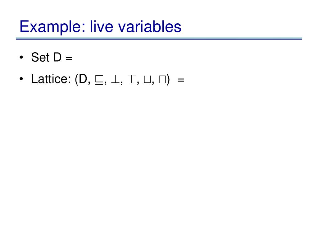 Example: live variables • Set D = • Lattice: (D, v, ?, >, t, u) =