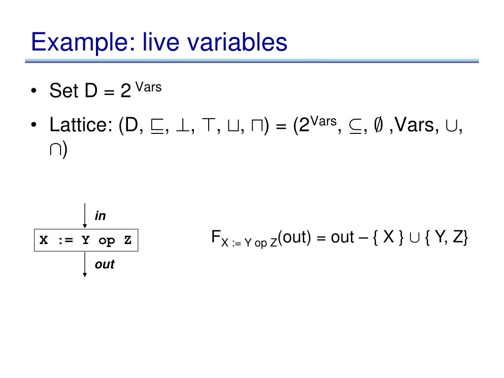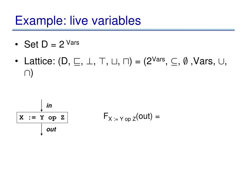 Example: live variables • Set D = 2 Vars • Lattice: (D, v, ?, >, t, u) = (2Vars, µ, ; ,Vars, [, Å) in FX := Y op Z(out) = out – { X } [ { Y, Z} X := Y op Z out