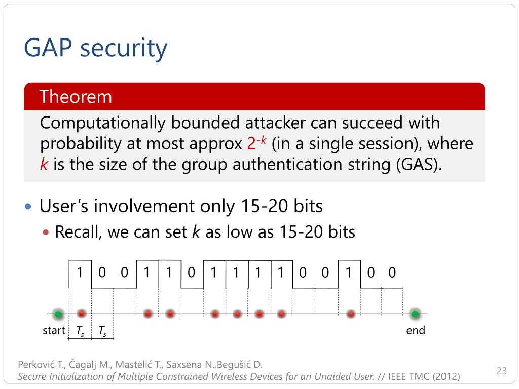 GAP security Theorem Computationally bounded attacker can succeedwithprobability at most approx 2-k(in a single session), where k is the size of the group authentication string (GAS). • User’s involvement only 15-20 bits • Recall, we can set k as low as 15-20 bits • 1 • 0 • 0 • 1 • 1 • 0 • 1 • 1 • 1 • 1 • 0 • 0 • 1 • 0 • 0 • Ts • Ts • start • end Perković T., Čagalj M., Mastelić T., Saxsena N.,Begušić D.Secure Initialization of Multiple ConstrainedWireless Devices for an Unaided User. // IEEE TMC (2012)