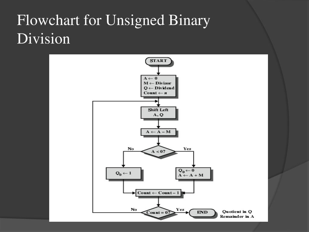 Division of Unsigned Binary Integers Quotient 00001101 Divisor 1011 10010011 Dividend 1011 001110 Partial Remainders 1011 001111 1011 Remainder 100