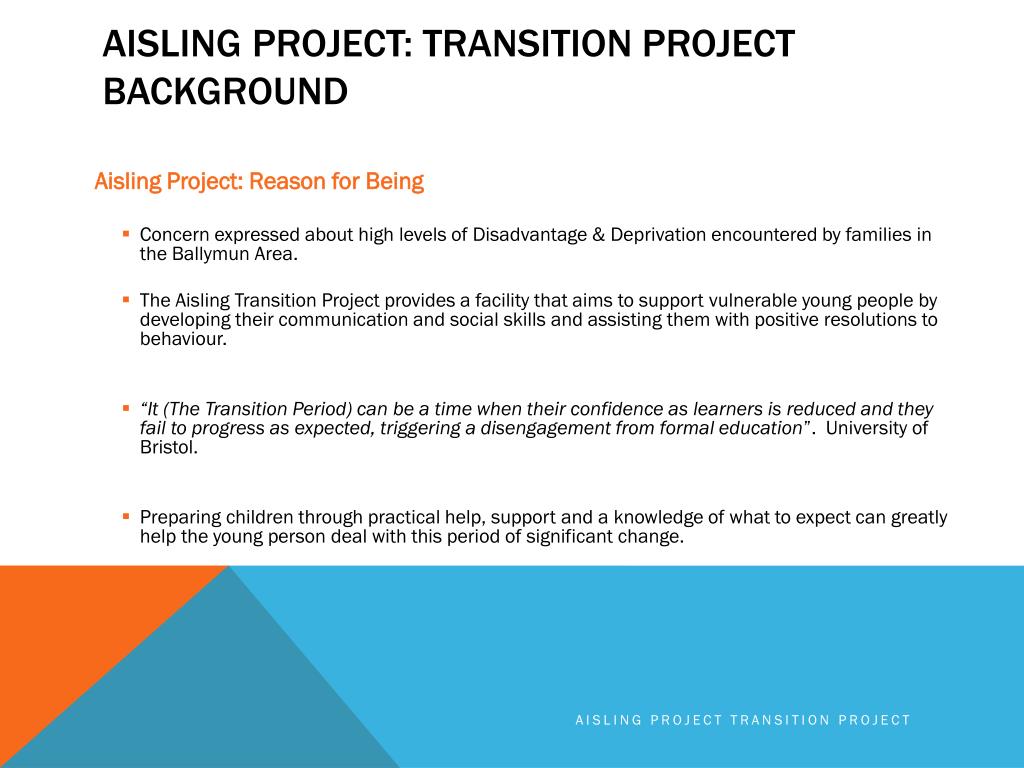 Transition Project Learning Network Workshop 3. Aisling Project: Transition Project. Aisling Project: Transition project Background. Aisling Project: Reason for Being Concern expressed about high levels of Disadvantage & Deprivation encountered by families in the Ballymun Area .
