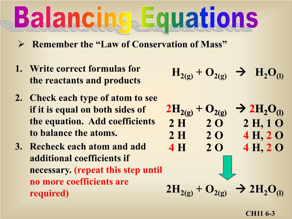 Balancing Equations • Remember the “Law of Conservation of Mass” • Write correct formulas for the reactants and products H2(g) + O2(g) H2O(l) • Check each type of atom to see if it is equal on both sides of the equation. Add coefficients to balance the atoms. H2(g) + O2(g) H2O(l) H2(g) + O2(g) 2H2O(l) 2H2(g) + O2(g) 2H2O(l) 2 H 2 O 2 H, 1 O 2 H 2 O 4 H, 2 O • Recheck each atom and add additional coefficients if necessary. (repeat this step until no more coefficients are required) 4 H 2 O 4 H, 2 O 2H2(g) + O2(g) 2H2O(l) CH11 6-3