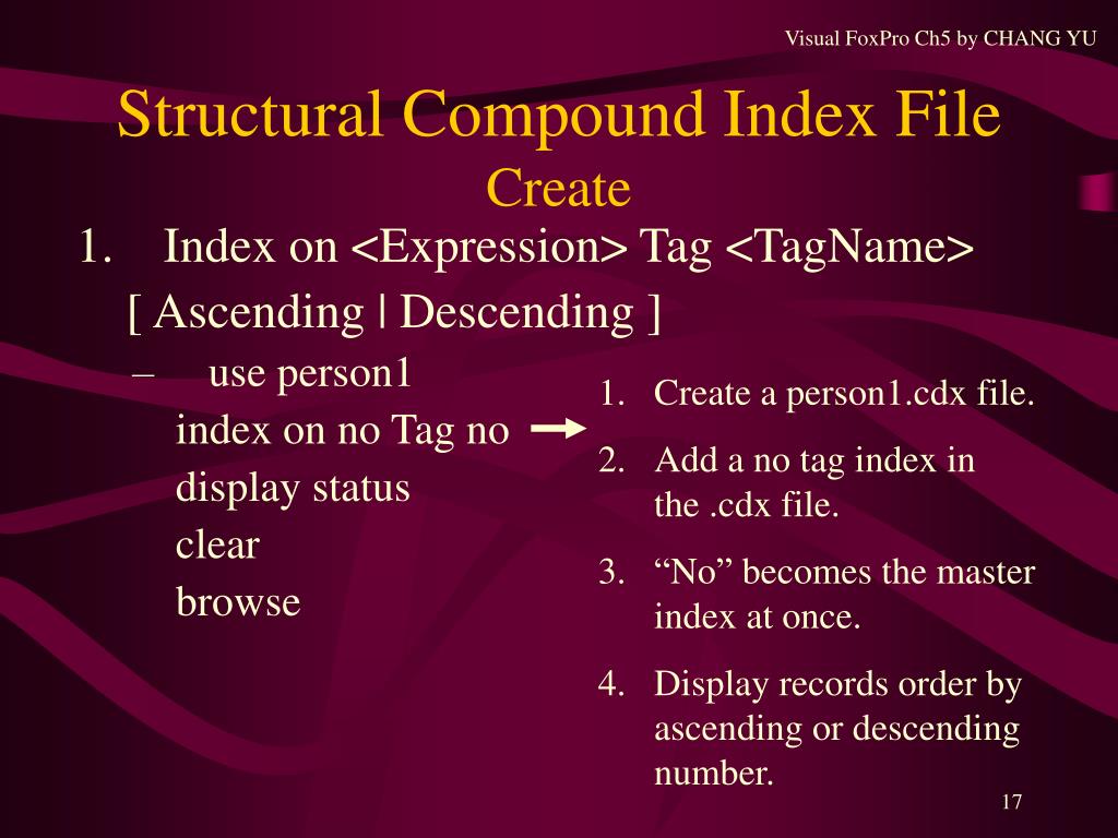 Visual FoxPro Ch5 by CHANG YU Non-Structural Compound Index File • Index on <Expression> Tag <TagName> Of <CDXFileName> [ Ascending | Descending ] • use person1 index on tel Tag tel of personns display status Tel is the master index.