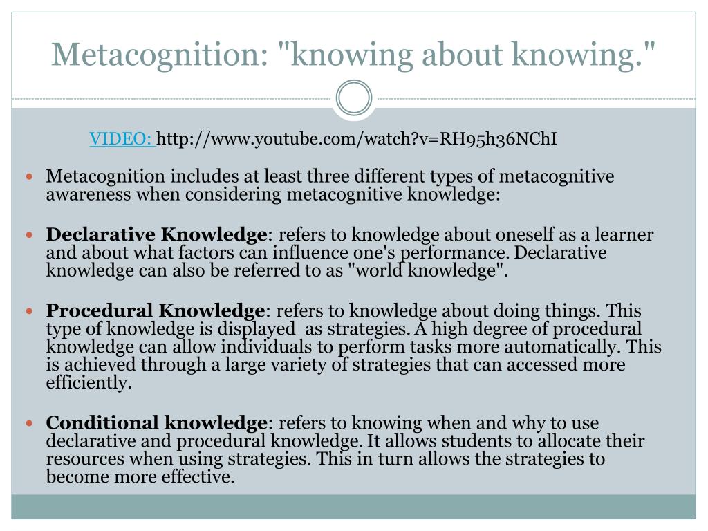 Metacognition: "knowing about knowing." Metacognition includes at least three different types of metacognitive awareness when considering metacognitive knowledge: Declarative Knowledge: refers to knowledge about oneself as a learner and about what factors can influence one's performance.Declarative knowledge can also be referred to as "world knowledge". Procedural Knowledge: refers to knowledge about doing things. This type of knowledge is displayed as strategies.A high degree of procedural knowledge can allow individuals to perform tasks more automatically. This is achieved through a large variety of strategies that can accessed more efficiently. Conditional knowledge: refers to knowing when and why to use declarative and procedural knowledge.It allows students to allocate their resources when using strategies. This in turn allows the strategies to become more effective. VIDEO: http://www.youtube.com/watch?v=RH95h36NChI